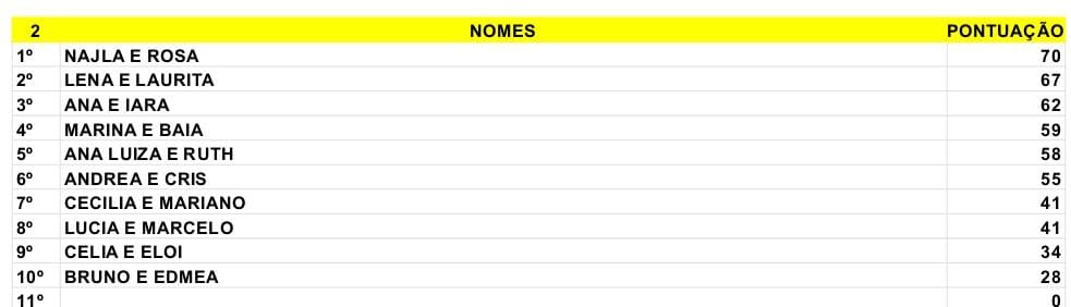 Serão disputadas 4 partidas de 45 minutos ou 3 mil pontos. Ao final das 4 rodadas, o pior resultado de cada dupla será descartado. Em caso de empate, o resultado descartado volta para a pontuação como critério de desempate. Caso o empate persista, a dupla com mais pontos na primeira rodada ficará à frente.